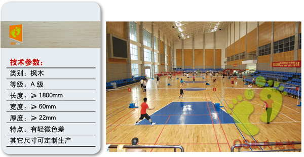 面层地板:枫木、柞木,体育运动木地板厚18mm至22mmm  宽为50mm至130mm  长度为300mm至2400mm;