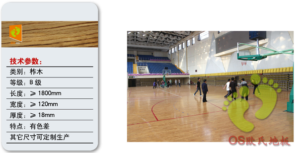 用此品种铺装地面,舒适、耐用。还能完全满足运动员对体育运动、篮球、羽毛球、网球、排球、乒乓球、壁球、舞台演出、舞蹈、健身等竞技项目的训练和比赛,体育运动木地板工程的设计在结构上除满足体育竞技和健身需求外,在选用材料上体现自然环保,在设计上还体现自然、和谐、时尚体育木地板是一种具有优良的承载性能,高吸震性能,抗变形性能的运动木地板,其表面的摩擦系数达到0.4-0.6太滑或太涩都会对运动员造成伤害。震动吸收性能达到了≥53%可有效的避免运动员受到运动损伤,而作为篮球场的体育木地板,还具有90%以上的球体反弹能力,能有效满足运动快节奏需求。