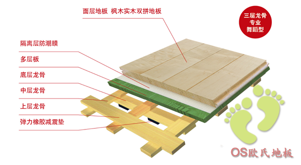 体育运动木地板—三层龙骨专业舞蹈型结构是我厂为迎合**体育地板行业的发展趋势及时研发的专业舞台木地板系统,它不但坚固耐用而且弹性十足,运动性能完全达到DIN标准的要求。并且具备舞台木地板所有功能:
